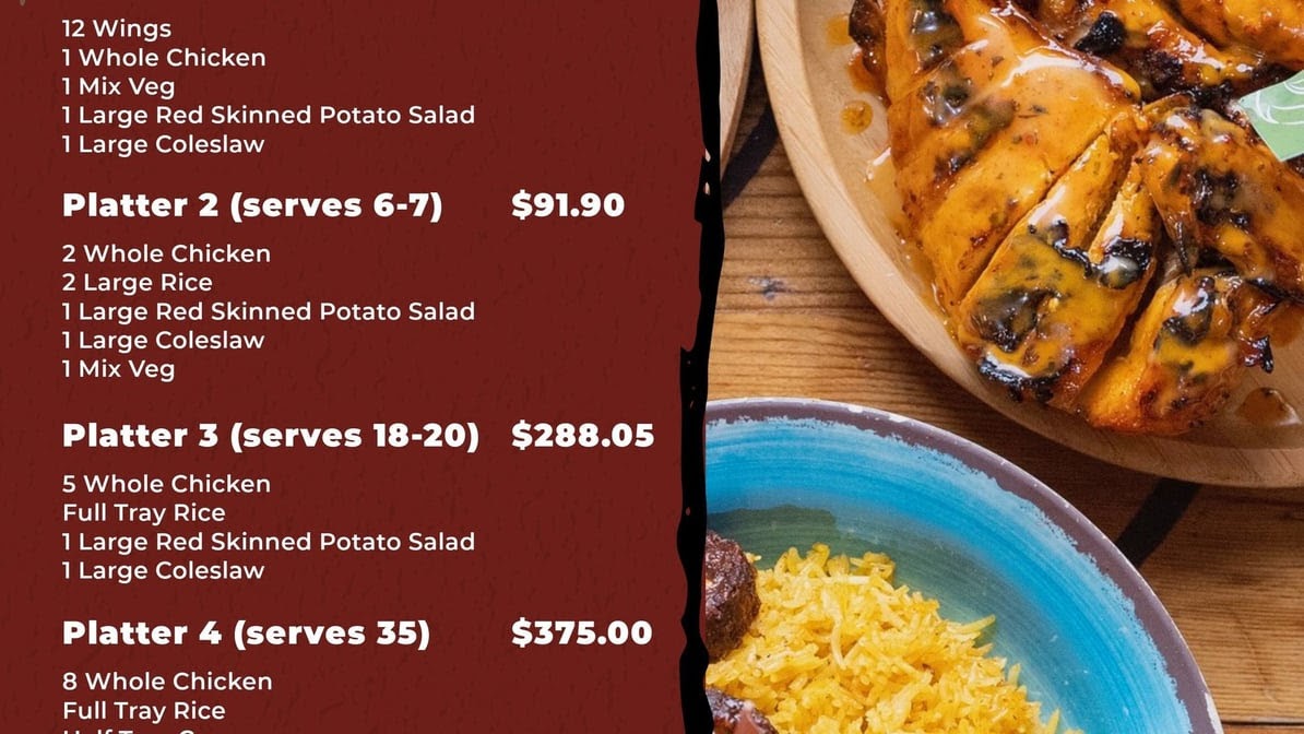 HOLIDAYS PLATTER 2 (Serves 6-7 People) 2 Whole Chicken 2 Large Rice Large Red Skinned Potato Salad Large Coleslaw Large Steamed Veg